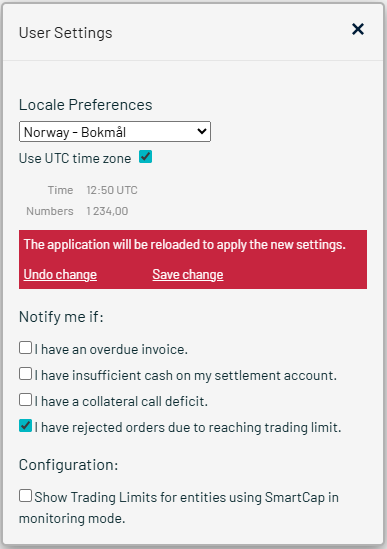 To change the User Settings, click on the username in the Banner as shown in the picture below and a User Settings box will open where you can change and save your preferences for Locale, Time Zone, Number format and Notifications & Configuration.
