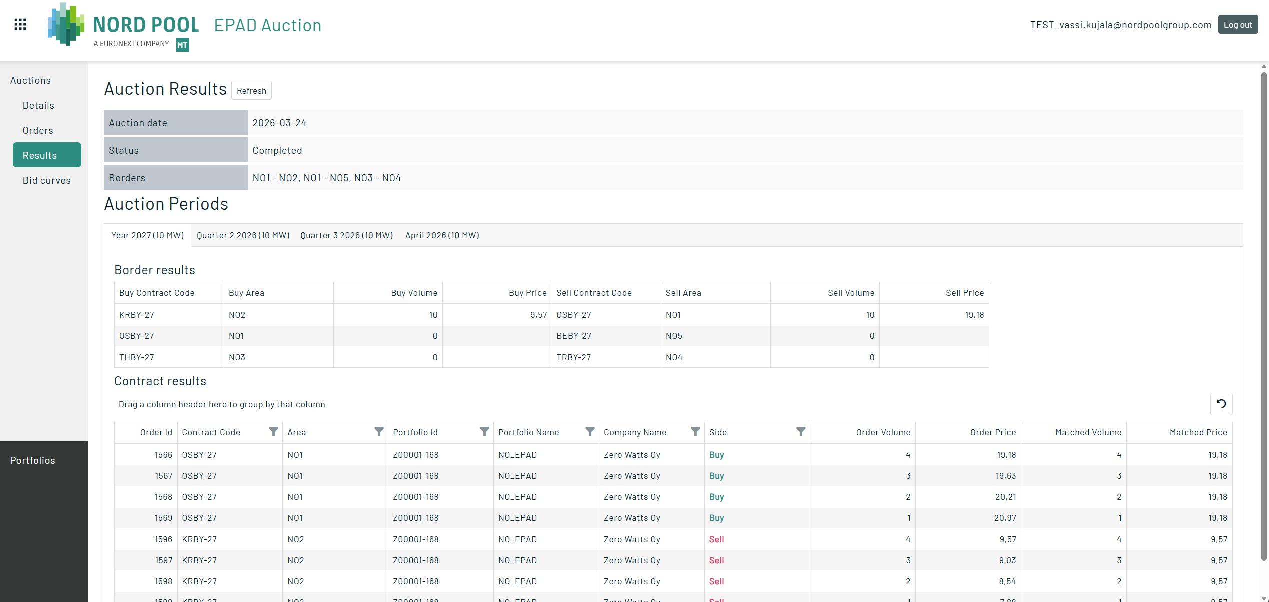From the contract results, the user can see their own results from the auction, how much volume did they sell or buy and for which price in each given price area they had orders in.